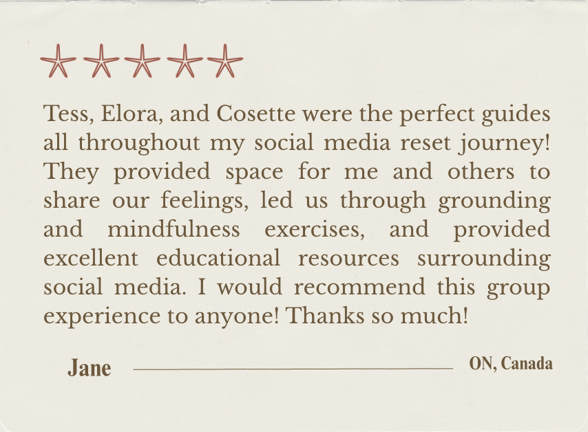 Each meeting blends grounding practices, reflection, and gentle psychoeducation to help you understand and shift your relationship with social media.