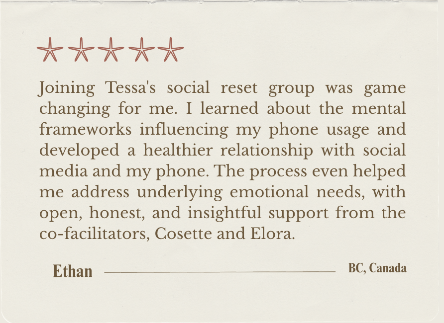 We’ll close by reflecting on what you’ve noticed over the past month and discussing how to re-enter social media (if you choose to) in a way that feels grounded and intentional. We’ll explore long-term boundaries and sustainable digital wellbeing.